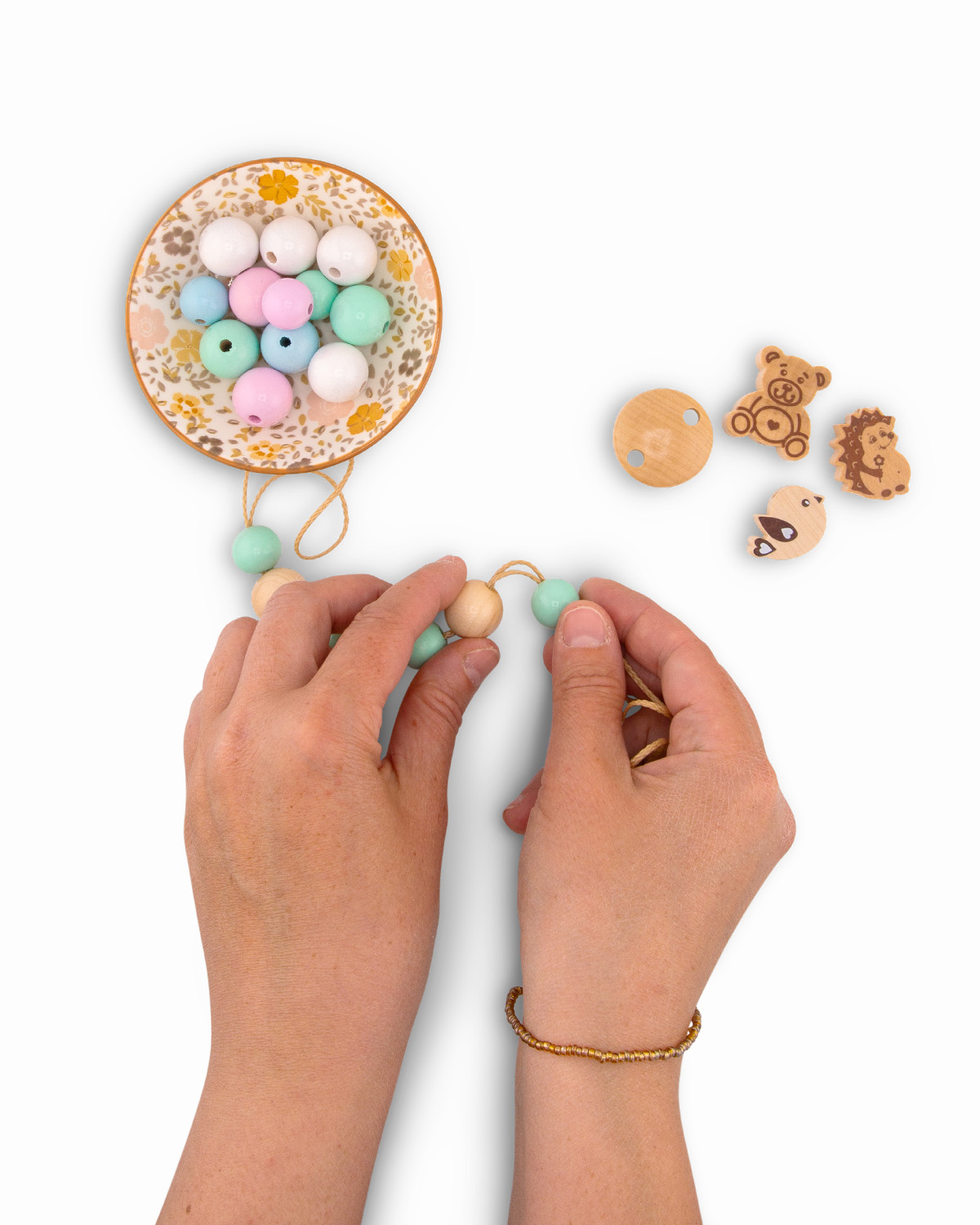 Die naturfarbenen Holzperlen stehen für Naturverbundenheit und Nachhaltigkeit. Dank schadstofffreier Materialien kannst du dir sicher sein, dass dein Baby unbedenklich mit dem Mobile in Kontakt kommt.
