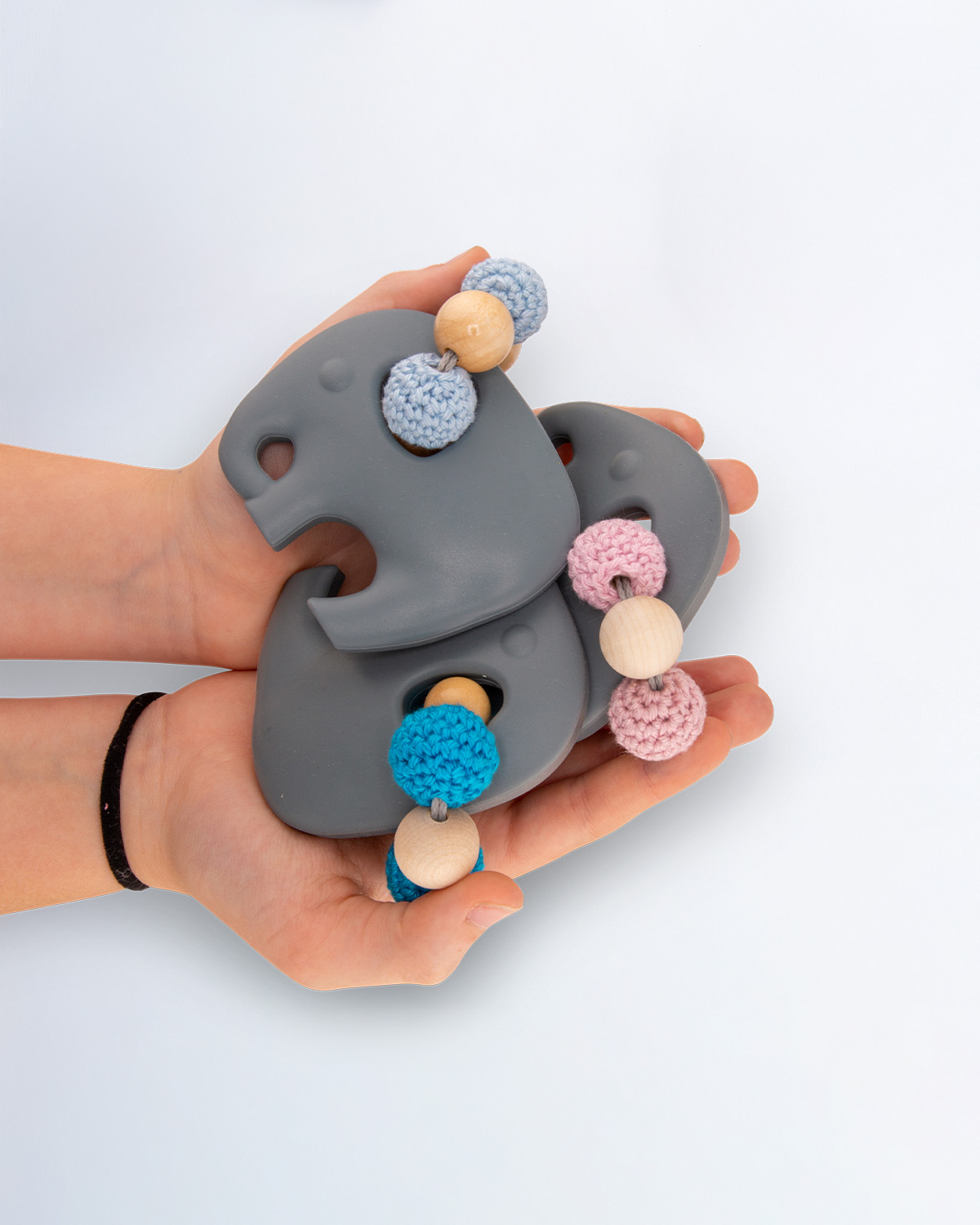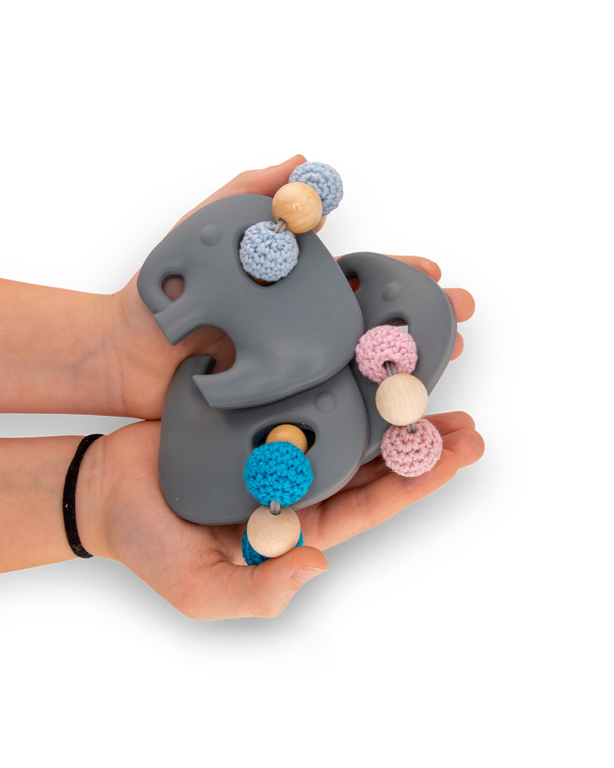 Der Zwergerlglück-Beißring wird in liebevoller Handarbeit aus hochwertigen, speichelfesten Holz- und Häkelperlen gefertigt. Highlight ist der weiche Silikon-Elefant, der sich beim Zahnen besonders angenehm anfühlt und Babys Juckreiz sowie Spannungsbeschwerden an der Kauleiste lindern kann.
